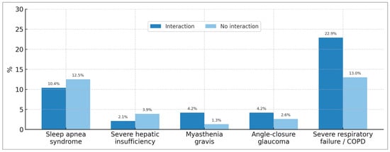 It is noteworthy that the patients interviewed were largely unaware of the contraindications for BZD use (Table 3). Thus, 52.1% of BZD users with interactions and 54.5% of BZD users without interactions stated that they were unaware of the contraindications. When investigating BZD treatment in patients with contraindications for its use, we observed significant figures. Five contraindications of particular interest for BZD use were explored: sleep apnea syndrome, severe hepatic impairment, myasthenia gravis, narrow-angle glaucoma, and severe respiratory failure/severe COPD (Chronic Obstructive Pulmonary Disease) (Figure 4). Respiratory failure/severe COPD was found to be the most prevalent contraindication, reaching 22.9% among BZD users with BZD–other drug interactions and 13.0% among BZD users without drug interactions. This is followed by the contraindication for sleep apnea, with prevalences of 10.4% and 12.5% for these same patient groups, respectively.