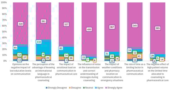 The question regarding the recognition of the low level of education of the patient, the pharmacist, or both parties as a disruptive factor in the communication process in the provision of pharmaceutical care obtained a majority who stated that they strongly agree (73.2%), agree (14.8%), neutral (2.7%), disagree (6.1%), and strongly disagree (2.9%). This distribution highlights the importance of education in pharmaceutical communication. Professionals in the field need to develop continuing education programs for staff and educational campaigns for patients. The lack of clear and accessible language can lead to confusion, reducing adherence to treatment. Interdisciplinary collaboration cand reduce barriers, leading to empathetic and effective counseling tailored to each person’s level of understanding.