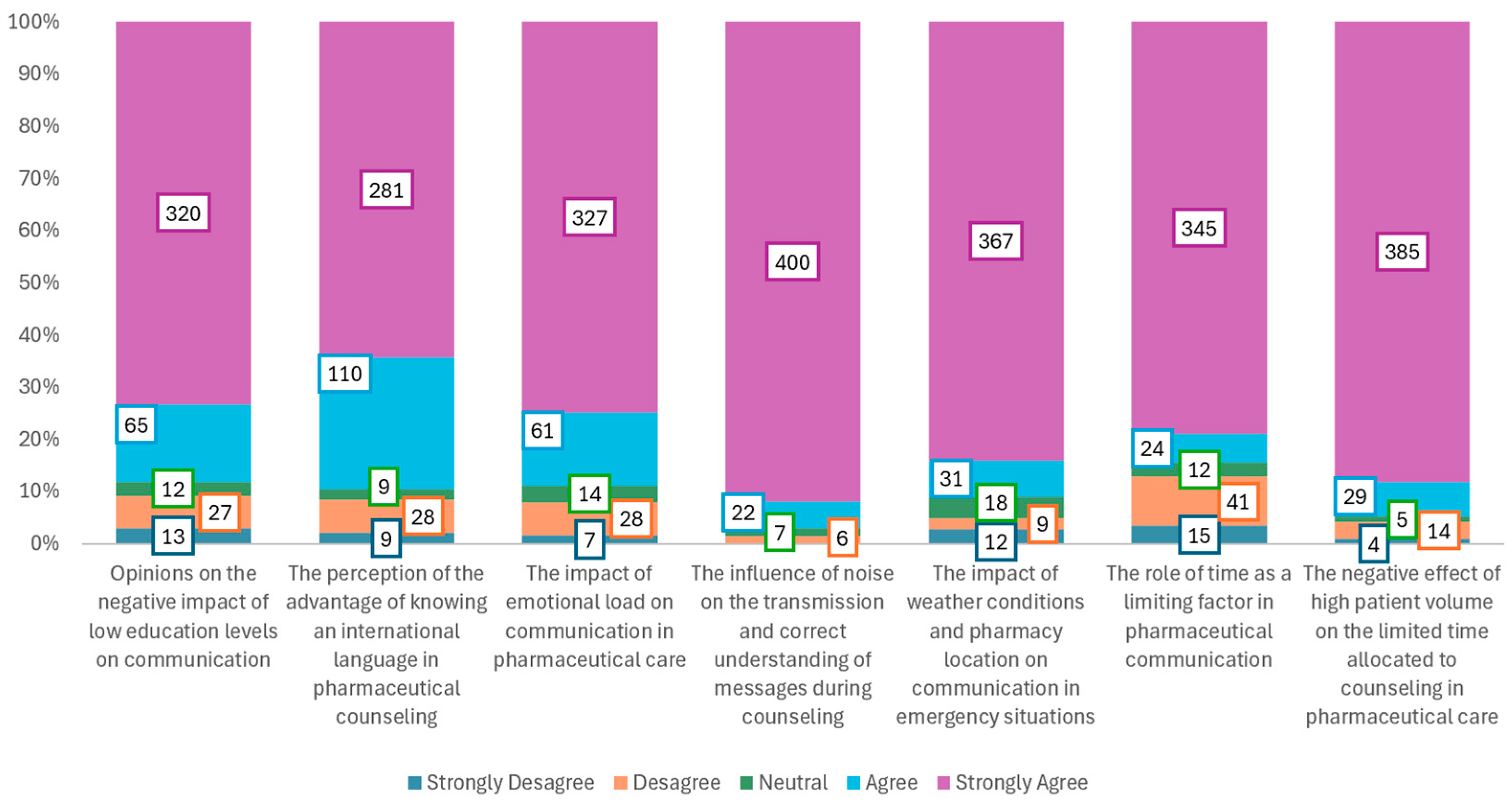 These average scores above 3 confirm the hypothesis that environmental conditions such as noise and location, along with high patient volume, are recognized as significant barriers to pharmacist–patient communication. The results support the need for strategies to reduce these barriers in order to improve the quality of counseling and patient safety in the medication dispensing process.