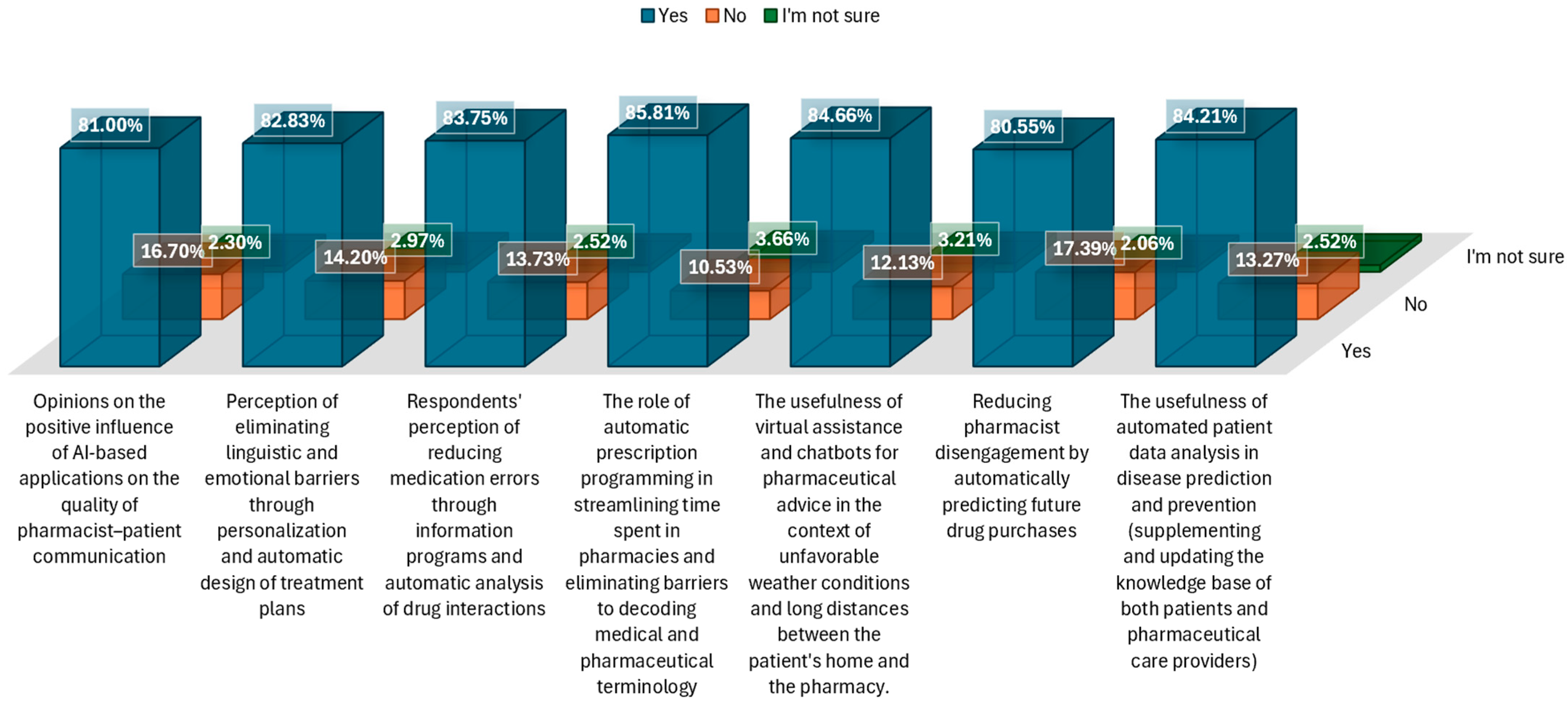 Table 7. Thus, for the question “Could artificial intelligence positively influence the quality of communication in the pharmacist–patient relationship?”, a very high