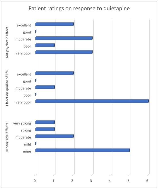 Patient ratings demonstrated a heterogeneous response to quetiapine in the treatment of PDP (Figure 1). Overall, perceived antipsychotic efficacy was limited, with most patients indicating only partial or insufficient symptom control.