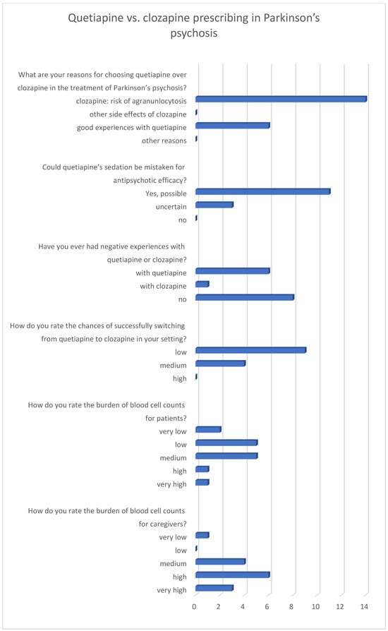 Physicians were recruited during continuing education sessions and through ward-based contact at Salzburg University Hospital. Eligible participants were neurologists and geriatricians involved in the care of patients with PDP. Participation was anonymous and voluntary. The questionnaire was administered in paper form and digitized for analysis. No incentives were provided. The physician questionnaire was designed as an exploratory instrument with both structured and open-ended elements. While clozapine-associated agranulocytosis and hematological monitoring were explicitly included based on prior evidence indicating their relevance for prescribing decisions, respondents were encouraged to report additional adverse effects and considerations for both clozapine and quetiapine in free-text responses. This approach was chosen to capture physician-prioritized factors rather than to systematically assess the full adverse-effect profiles of the respective agents.