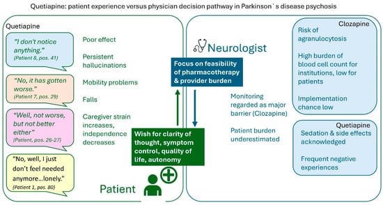 Integrated quantitative and qualitative data link patient-reported experiences with physician prescribing considerations in PDP. Patients reported limited perceived antipsychotic efficacy of quetiapine, with persistent psychotic symptoms, sedation, and minimal quality-of-life improvement despite acceptable motor tolerability. Physician data similarly indicated limited efficacy, while emphasizing feasibility, safety, and monitoring requirements. Two clozapine-treated patients reported subjectively meaningful symptom improvement; these observations are descriptive and non-generalizable. The integrated analysis juxtaposes patient experiences and physician decision pathways without inferential interpretation (Figure 3).