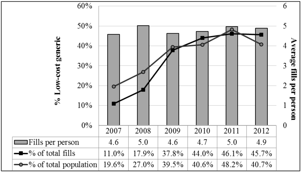 Trends in the use of LCGPs, including the proportions of LCGP fills and LCGP users in each year as well as the total number of prescription fills per person are presented in Figure 1. Proportions of both LCGP users and LCGP fills in each year increased significantly from 2007–2012. The proportion of prescriptions available through LCGPs that were obtained through LCGPs more than quadrupled from 11.0% in 2007 to 45.7% in 2012. Over the same time period, the proportion of LCGP users more than doubled from 19.6% in 2007 to 40.7% in 2012. While the proportions of LCGP users and LCGP fills both increased significantly from 2007–2012, overall pharmaceutical utilization remained relatively constant with approximately 4.8 prescription fills per person per year.
