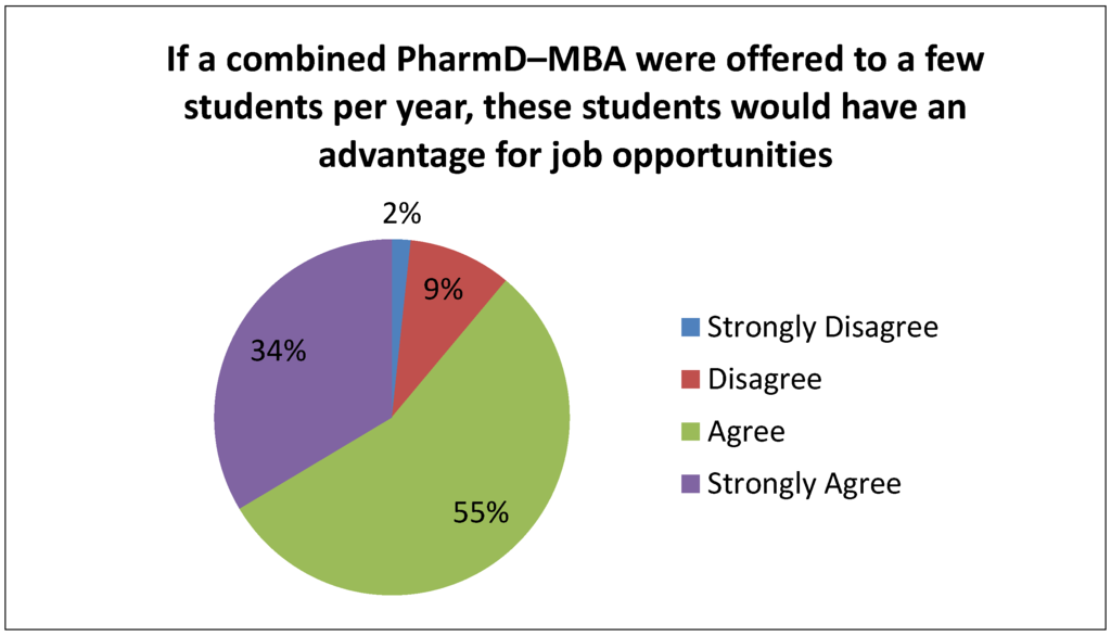 The results of the student and pharmacist questionnaires indicate that there is a level of demand for a combined PharmD/MBA program. When asked if they would have pursued a combined pharmacy–MBA degree had it been offered to them, 54% of pharmacy students and 58% of pharmacists either agreed or strongly agreed. Granted, this amount would not be expected to actually apply for a combined program, but this does indicate some level of interest on behalf of both future and present pharmacists. From a stakeholder perspective, it was felt that the College of Pharmacy and Nutrition should entertain looking into a combined degree. The responses from these 3 groups are important for program planners and developers, as it is the only known published assessment of demand that we are aware of.