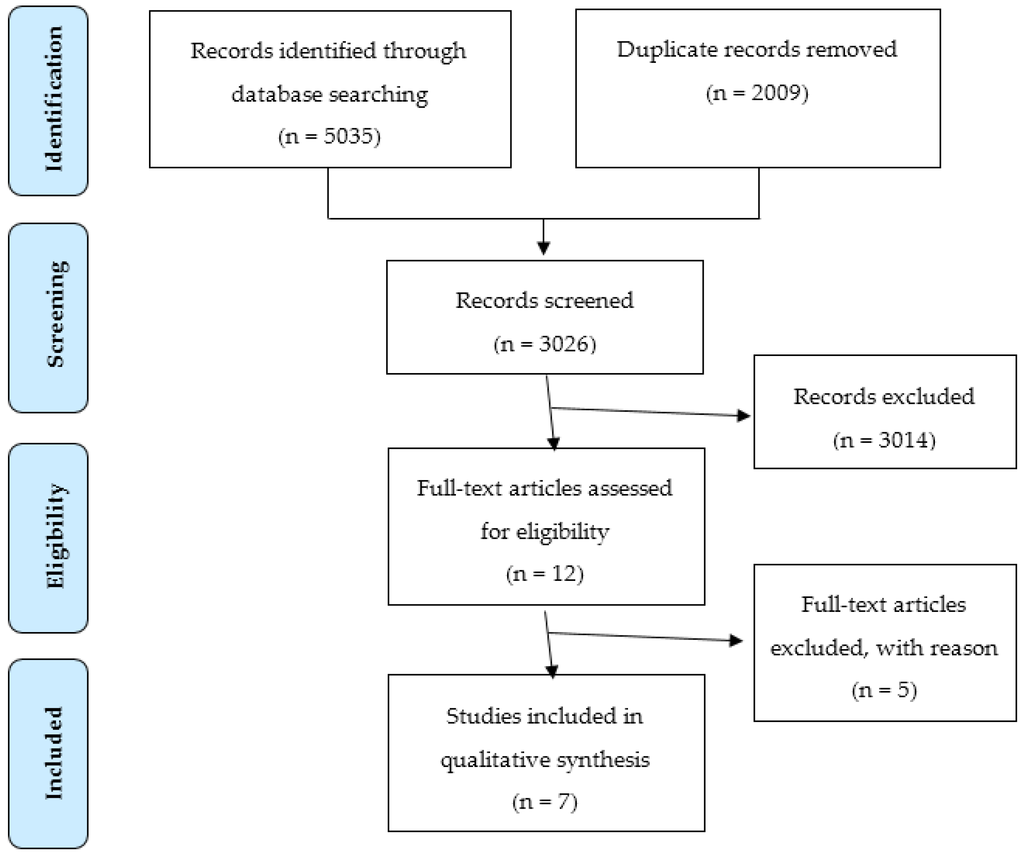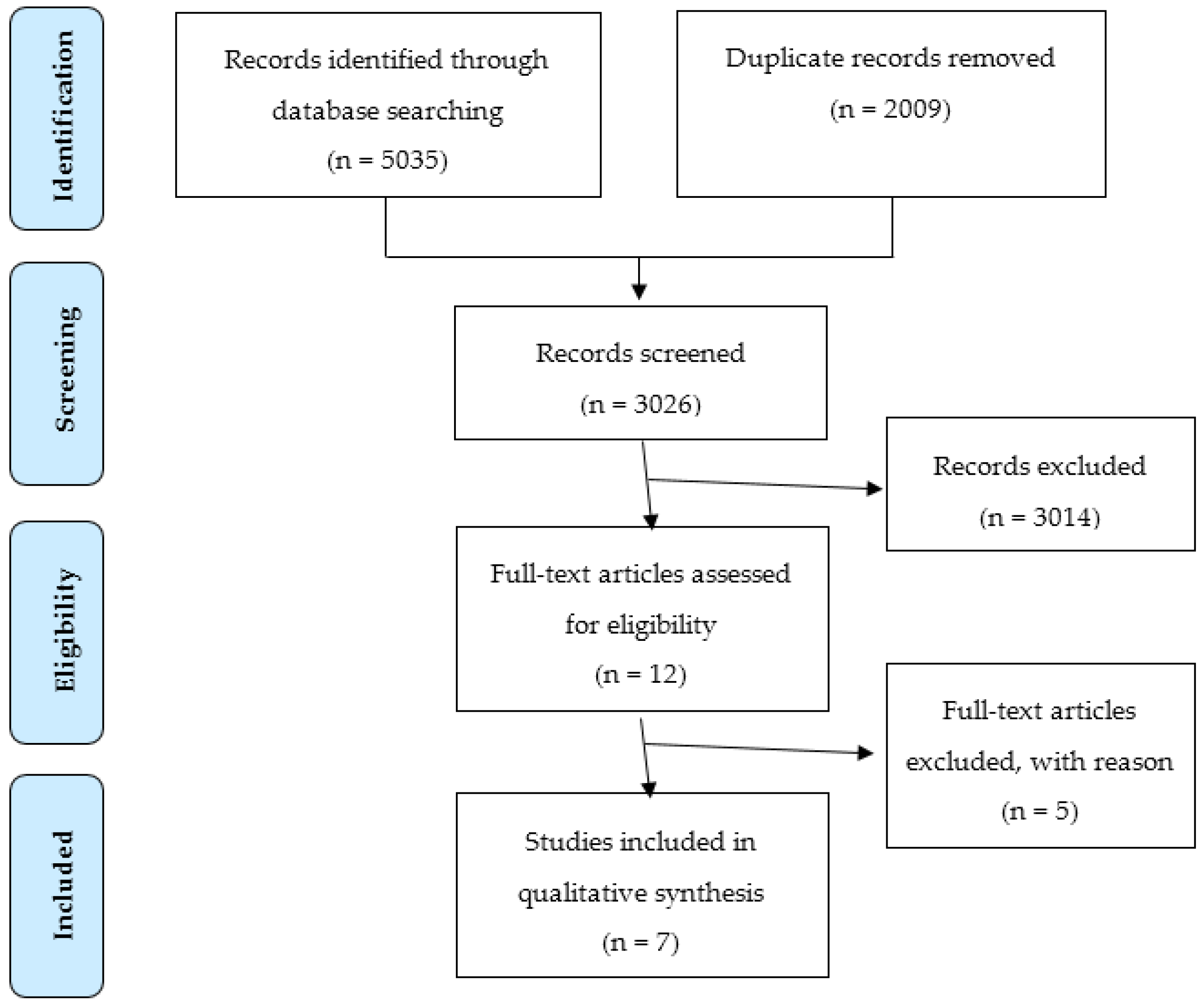 From the database search, 5035 records were identified, leaving 3026 after removal of duplicates. Records were reviewed for inclusion based on the reviewing of the title or the abstract of each record, and 2899 records were excluded based on the titles and another 115 based on the abstracts. The full-texts of the remaining 12 articles were read and three of them were excluded. Reasons for exclusions are given in Table 1.