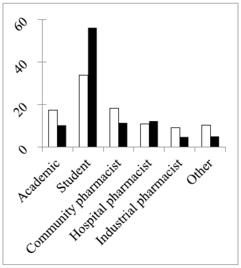 The percentage of double replies was generally low. It was highest for industrial (16%) and hospital pharmacists (15%; Table 2). Thus, in these two groups, just under one fifth of replies in the two rounds, in all probability, came from the same person. The percentage of double replies for students was very low (0.6%), showing that two different student populations answered the questionnaires in the two different rounds. This reveals a certain conflict in the student group between two of the principles of the Delphi methodology: iteration and anonymity. Iteration would require that the composition of the expert panel remains the same, i.e., that the same people are surveyed, in the different rounds. However, in order to maintain anonymity, the decision was taken not to collect email addresses in the first round and to resend the survey to the same email addresses in the second round (so ensuring that the same people were contacted). We hoped to overcome the difficulty arising from the conflict of “iteration versus anonymity” by using the same global email listings for the different groups in the two rounds and this with the objective of contacting the same people.