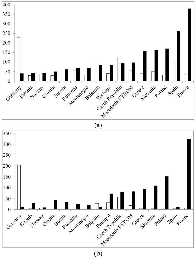 Total number of respondents per country (a); and number of students per country in the two rounds (b) (open columns: Round 1; full columns: Round 2).
