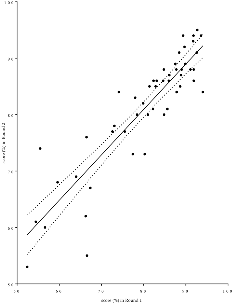 Given that the subject matter of proposed competences was not substantially altered between rounds, scores for the same competences were compared between Rounds 1 and 2. Linear regression analysis was used (see Figure 8). Two provisos have to be made regarding such use. It is not known whether the variable “score” is normally distributed. Given that the score is a transformed variable calculated on the basis of ranks that are highly skewed to the right suggests that scores may have a non-normal distribution. Furthermore, the exact wording of the individual questions asked differed between the two rounds. In Figure 8 is given as a graphic aid to understanding of the relationships between the two rounds. The non-parametric Spearman correlation coefficient “r” was 0.88, p < 0.0001. Global means were 80% for Round 1 and 81% for Round 2.