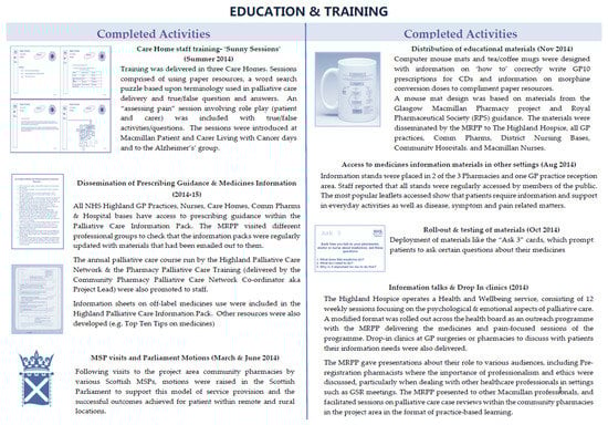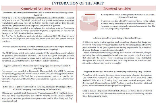 The MRPP undertook a variety of activities over the project time period (January 2014 to December 2015). These included: attendance and contribution at MDT meetings in various settings; development of clinics within the community pharmacy setting; design and dissemination of pharmaceutical palliative care educational resources and training sessions.