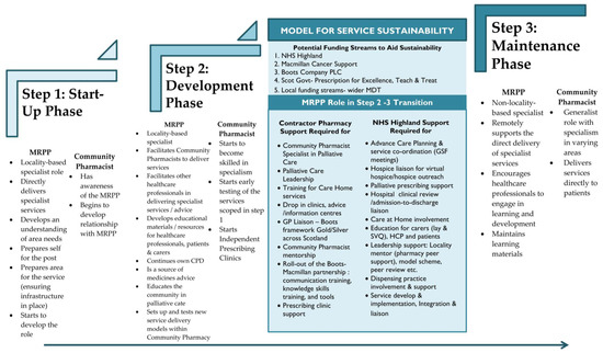 To support evolving rural services, Figure 3 details a potential model for delivery of pharmaceutical palliative care services that is composed of three essential steps: Start-Up, Development and Maintenance. Moving through the steps the key roles and responsibilities of the MRPP gradually shift towards the local Community Pharmacist(s), with the MRPP graduating from locality-based hands on role to a more regional-based supporting and facilitating role for local champions. It was acknowledged that successful delivery of the model is dependent on alignment of resources, infrastructure and local community support. Sustainability of the service is perhaps the most important aspect. The addition of this domain puts into context current policy/funding drivers and key factors (in this case for NHS Scotland) necessary for delivery of pharmaceutical palliative care services. The three elements of this sustainability domain are: