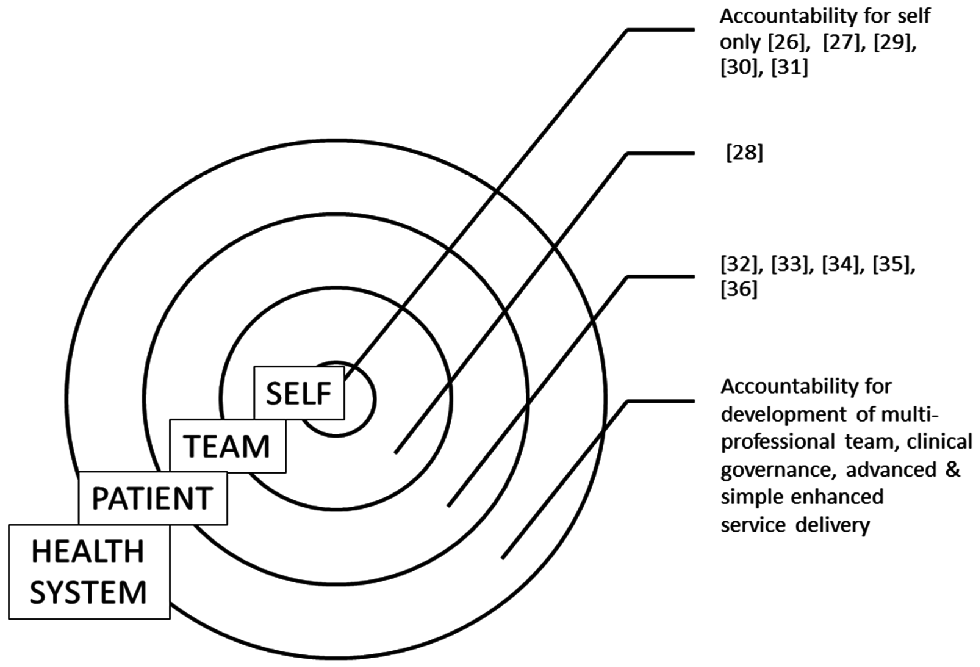 Thus, although the curriculum has been described as being focused on accountability, it is in fact focused on accountability to the self, to the team or accountability to patients/clients. The curriculum examples cited in this paper are displayed according to the focus of the sphere of influence for curriculum innovation, i.e., self, team, patient/client and the broader health system, in Figure 1.