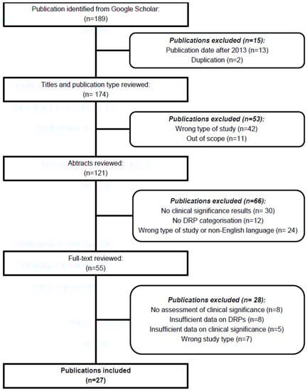 A total of 189 studies were identified in the Google Scholar search (Figure 1). After removing 15 papers due to duplicate records and publication dates after 2013, the in- and exclusion criteria were applied to 174 unique publication titles and subsequently to 121 unique abstracts (Figure 1). Of these, 55 full-text publications were reviewed, and 28 were excluded due to: No assessment of clinical significance (n = 8) [,,,,,,,], Insufficient data on DRPs (n = 8) [,,,,,,,], Insufficient data on clinical significance (n = 5) [,,,,], and Wrong study type (n = 7) [,,,,,,]. Finally, 27 unique publications were included in the review [,,,,,,,,,,,,,,,,,,,,,,,,,,].