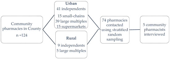 Stratified random sampling strategy based on community pharmacies in one English county. A total of 74 out of 124 community pharmacies in six different business type/location combination were contacted resulting in five responses.