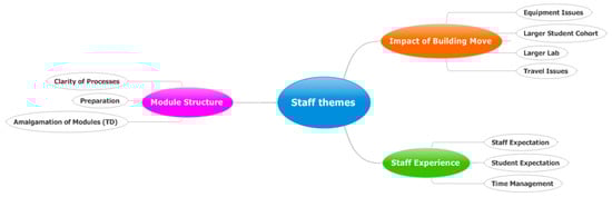Three overarching themes were identified from the staff focus group: Impact of building move (6 comments in total), Staff experience (7 comments in total) and Module structure (7 comments in total) (Figure 4).
