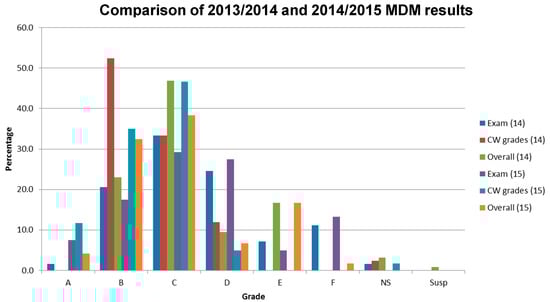 Comparison of Medicine Design and Manufacture (MDM) exam results between 2013/2014 and 2014/2015.