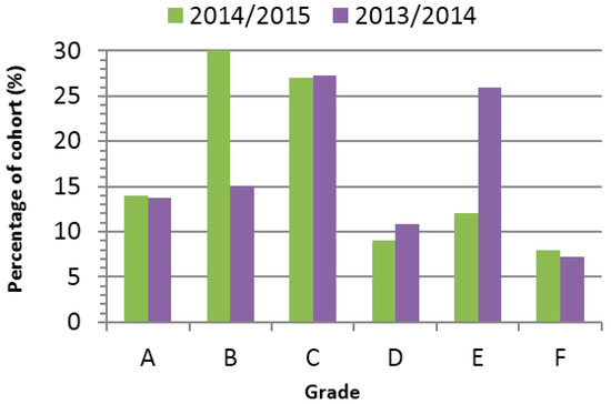 As part of the module reorganisation, the written exam was moved to the end of the first semester. This required that the students learn the material from semester one, before undertaking the practical project in semester two. It was believed that this would allow the ‘deep learning’ to fully occur. The third-year TD module enjoyed a significantly higher pass rate for 2014/2015 compared to 2013/2014 (79% compared to 67%) (Figure 6). There are many possible reasons for this. Firstly, the new amalgamated module had time to ‘bed in’, whereas last year was the first iteration of it. Staff were much more comfortable with the new lab layout, the larger student cohort and the projects they were running this year. This was also the first year of students who had been through the new PBL MDM module previously, so there is a possibility that the previous experience of a mini-project had prepared the students for the third-year module. These short-term improvements in pass rates have been seen previously in other studies [3].