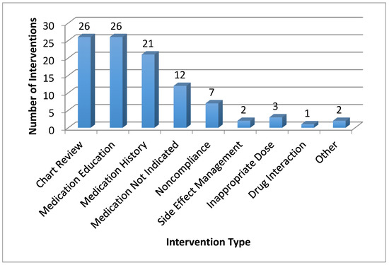 There were a total of 100 pharmacist interventions made during pharmacist-led comprehensive medication reviews during the study period. Figure 1 displays the number and category for these interventions. The most frequent interventions involved thorough chart review from the pharmacist and medication education for all patients. In addition, the patient’s medication profile was updated for 21 of the 26 patients (81%), which previously had missing or inaccurate information upon completion of their provider appointment. The remaining five patients already had updated medication records upon completion of their primary care provider appointment, which was confirmed through the comprehensive medication review.