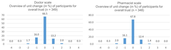 Unit changes for doctor and pharmacist trust scales between baseline and 6-month for each question are presented in Figure 1, and illustrate a normal distribution of change in trust, indicating no shift in overall trust. In the vast majority of cases where trust either increased or decreased, it was a change in trust by only 1 unit on a 5-point scale. There were no significant associations between loss of trust and age, medication class, sex or intent to discuss deprescribing with either the doctor or pharmacist.