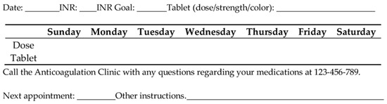 Given the need to make adjustments to the dosing, it is recommended to provide written instructions for the patient, as shown in Figure 1 [43]. A wealth of evidence-based resources are available in assisting practitioners on how to effectively educate patients on warfarin [43,45].