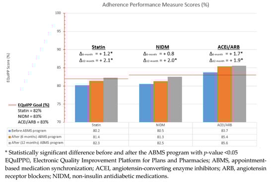 The objective of this study was to evaluate the impact of implementing an ABMS program on pharmacy adherence measures for statins, ACEI/ARBs, and non-insulin diabetic medications (NIDM). The Electronic Quality Improvement Platform for Plans and Pharmacies (EQuIPP©) is a platform that allows the pharmacy to analyze their impact on patient adherence measures. EQuIPP© provides performance data that is unbiased and reflects current CMS Star Ratings [12]. It was hypothesized that initiation of ABMS would increase EQuIPP© adherence measures for these drug classes.