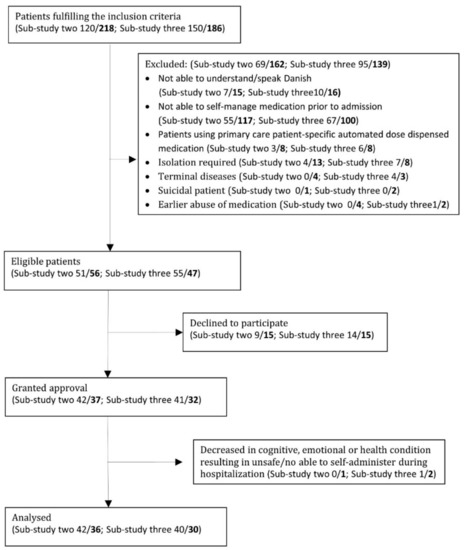 Inclusion criterion for all three sub-studies was: age ≥ 18 years. Exclusion criteria were: inability to self-manage medication prior to admission; inability to understand Danish; decrease in cognitive, emotional or health condition during hospitalization resulting in unsafe/lacking ability to self-manage medication; history of medication abuse; terminal disease; suicidal ideation; isolation; and use of patient-specific automated packed medication prior to hospitalization (a uni-dose medication packing service sold by primary Danish pharmacies). Information about exclusion criteria was collected from patient records and patient interviews. Patients were excluded if there was any doubt about meeting the exclusion criteria.