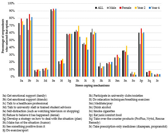 The findings relating to stress coping mechanisms are illustrated in Figure 3. As can be seen, the three most popular stress-coping mechanisms were self-distraction (3e) and getting emotional support from friends (3b) and from family (3a). More female students than males sought emotional support from friends (3b) and family (3a), comfort ate (3p), and meditated/prayed (3m).