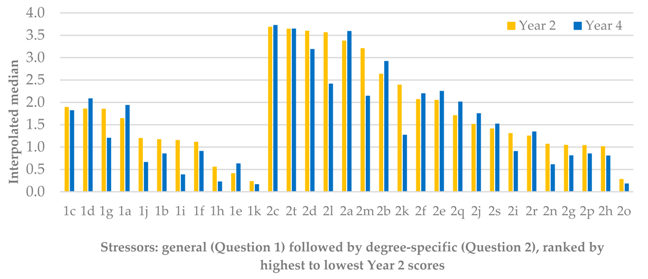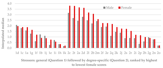 The findings for each stressor (by gender and year group) are outlined in Figure 1 and Figure 2. As can be seen in Figure 1, females had higher interpolated medians than males for most stressors. Additionally, from Figure 2, some stressors of note that affected Year 2 more than Year 4 were oral presentations (2l), role plays with staff (2m), and practical classes (2k).