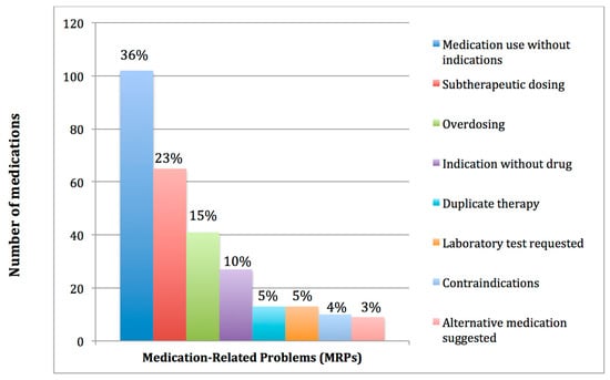 The most common Medication-Related Problem identified, among all suggested interventions, was medication use without indication 36% (102/280). This included: Proton pump inhibitors 15% (15/102); laxatives 14% (14/102); antiplatelet agents 11% (11/102); and, statins 8% (8/102). The second class of MRPs was subtherapeutic dosing, 23% (65/280), followed by overdosing, 15% (41/280). Figure 1 presents the frequency of different types of Medication-Related Problems.