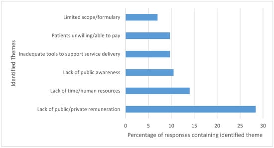 The survey also encouraged respondents to provide additional comments on their experience and their perspectives of providing assessment and drug prescribing services for self-limiting conditions. Some common themes that emerged from these open-ended questions included a lack of public and private payer remuneration for services, a limiting scope of practice and prescribing formulary, insufficient public awareness of services, and an absence of adequate documentation and decision-making tools (see Figure 1).