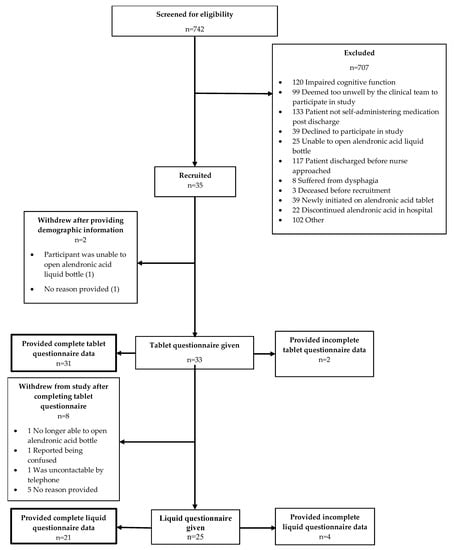 Figure 1 summarizes participant flow throughout the study. Of the 742 patients screened for inclusion, 35 (5.27% ± 1.67) were recruited. The primary reasons for exclusion were not able to self-administer medication, impaired cognitive function and the patient being discharged before they could be approached. A total of 35 patients consented and provided demographic information; however, 2 (5.7%) participants withdrew before completing the tablet questionnaire. Of the remaining 33 participants who completed the tablet questionnaire, eight (24.2%) withdrew from the study before completing the liquid questionnaire. Data for 25 liquid questionnaires were returned, which was within the target sample size range; however, four (16.0%) were incomplete.