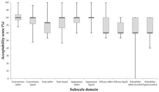 Spearman and Pearson correlations between each of the five subscale domain scores and global acceptability are summarized in Table 2. For the tablet, only the subscale domains of convenience and taste demonstrated a significant positive correlation with global acceptability. For the liquid all the subscale domain scores demonstrated a positive correlation with global acceptability and in all cases, except for tolerability, these were significant relationships.