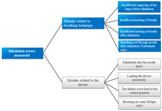 Errors were defined as: displays of flawed technique or lack of knowledge regarding usage of the inhaler device that conflicted with the inhaler instructions provided by the manufacturers or were causing non-optimal inhaler effect. The errors measured from previous studies were used when compiling the checklist [25]. The errors measured can be observed in Figure 2. Table A1 shows the inhaler instructions participants received for each inhaler in the educational videos, as well as the errors deemed critical for each inhaler. The error assessments for each inhaler type vary somewhat depending on the instructions given to participants. For example, ”Holding one’s breath after the inhalation” was assessed for Diskus, Easyhaler and Ellipta, but not for Turbuhaler, because this step was not included in the video instructions.
