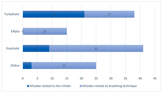 When comparing the most common inhalation errors, insufficient emptying of the lungs emerged as the most frequently occurring inhalation error for all inhalers. For Turbuhaler, failure to load the device was as common as insufficient emptying of the lungs. The total number of inhaler related and breathing related errors for each device type can be found in Figure 3.