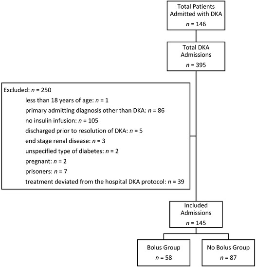 A total of 146 patients were admitted 395 times with an ICD-9/ICD-10 diagnosis of DKA between 1 September 2014 and 30 June 2016. Each hospital admission was evaluated separately. A total of 250 admissions were excluded from the analysis: 1 patient was less than 18 years of age, 86 patients had a primary admission diagnosis other than DKA, 105 patients did not receive an insulin infusion, 5 patients were discharged prior to the resolution of DKA, 3 patients were excluded for end stage renal disease, 2 patients were excluded for an unspecified type of diabetes, 2 patients were pregnant, 7 were prisoners, and 39 patients received treatment that deviated from the hospital’s DKA protocol. One hundred and forty five admissions from 76 patients were analyzed. A summary of admissions meeting inclusion and exclusion criteria is presented in Figure 1.