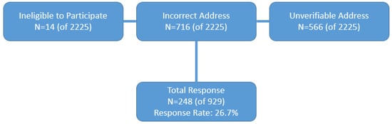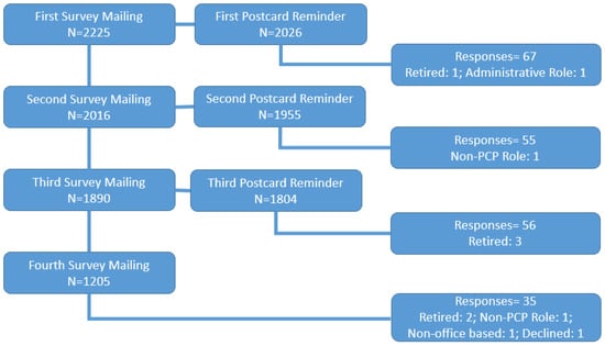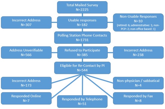 The initial mail survey of 2225 lead physicians resulted in 182 useable responses, with 307 surveys returned as undeliverable. After repeated mailings, attempts to increase response rates were made by contacting all non-responding physicians (n = 1731) during the summer of 2015 via telephone by a university-based polling station. An additional 802 physicians were eliminated from the sample for the following reasons: Incorrect addresses (n = 236), unverifiable addresses (n = 566), or refusal to participate (n = 385). The remaining 544 non-responding physicians were then re-contacted by the PI; an additional 173 addresses were deemed incorrect. These efforts to reduce non-response yielded an additional 66 survey responses (51 via telephone, 8 via fax, and 7 via online survey). This resulted in a total of 248 responding physicians, representing a final response rate of 11.1% and an adjusted response rate of 26.7% (after correcting for incorrect and unverifiable addresses) (Figure 1, Figure 2 and Figure 3).