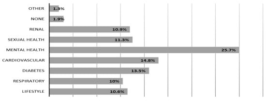 The majority of the pharmacists (90%, n = 94) believed that they needed further training on their consultation skills and only (10%, n = 11%) did not agree. There was a range of clinical areas where pharmacists reported that they needed further training, especially to allow them to approach patients. These included mental health (25.7%, n = 80), cardiovascular (14.8%, n = 46%), diabetes (13.5%, n = 42) sexual health (11.3%, n = 35), renal diseases (10.9%, n = 34), and respiratory (10%, n = 31) as shown in Figure 1 below.