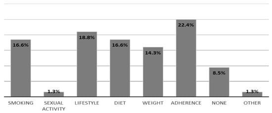 Pharmacist respondents were asked if they had observed behavioural changes which they felt had occurred due to any advice they had given to their patients (Figure 1). The most common (22.4%, n = 50) response was a positive change in adherence to prescribed medication. Around (18.8%, n = 42) of pharmacist respondents stated that they had observed changes in patients’ lifestyles after carrying out consultations. This included smoking cessation (16.6%, n = 37) and healthy diet change (16.6%, n = 37). Weight reduction was observed less frequently (14.3%, n = 32). Other behavioural changes included (1.3%, n = 3) alterations in healthy sexual activity and improved self-care management (1.3%, n = 3). A small proportion (8.5%, n = 19) of pharmacists’ responded that they had not observed any behavioural changes in patients after carrying out their consultations. The remaining pharmacists reported that they were never given the opportunity to follow-up patients after a patient consultation, and therefore had not observed any behavioural changes in their patients and were not able to provide such information (please see Figure 2).