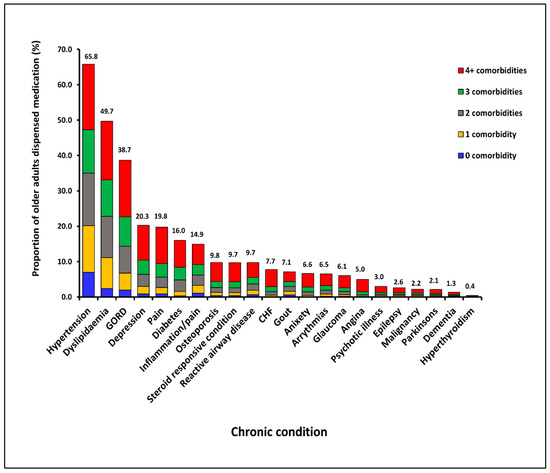 We investigated the occurrence of medication dispensation for one or more of 22 CCs among older Australians over the period 2013–2016 using a nationally representative medication claims dataset. We found that 79% of older adults were dispensed medications for ≥2 CCs, and this remained stable over the four-year period.