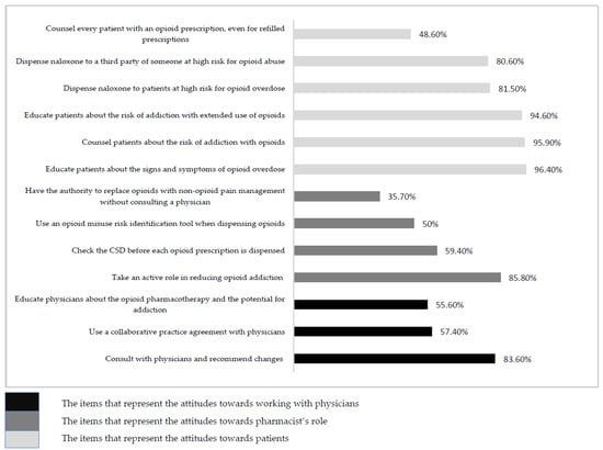 The mean total attitude score of the respondents were 50.71 (SD 7.96). Their attitude towards their role was 14.32 (SD 3.24), towards working with physicians in opioid crisis management was 11.22 (SD 2.6), and towards educating patients was 25.18 (SD 3.8). Although 85% of the respondents reported (agreed or strongly agreed) that pharmacists should take an active role in reducing opioid addiction, only one-third reported using an opioid misuse risk identification tool. Though almost 60% of the respondents agreed that they should check the CSD before dispensing any opioid prescription, 52% reported using the CSD with every new opioid prescription and less than 30% reported using it with every opioid refill prescription. While more than 80% of the respondents agreed that pharmacists should recommend changes to physicians when opioids are prescribed outside opioid prescribing guidelines, only 57% agreed that it is the pharmacist’s role to educate physicians about opioid therapy, and only 36% agreed that pharmacists should have the authority to replace opioids with non-opioid pain management. Though almost all pharmacists (96%) agreed that they should educate patients on the signs of opioid overdose and risk of opioid addiction, and approximately 80% agreed that pharmacists should be dispensing naloxone to high-risk patients and third parties like family and friends, only less than 50% agreed that they should be counseling every patient with an opioid prescription. Figure 1 demonstrates the attitudes of pharmacists about their role in opioid crisis management.