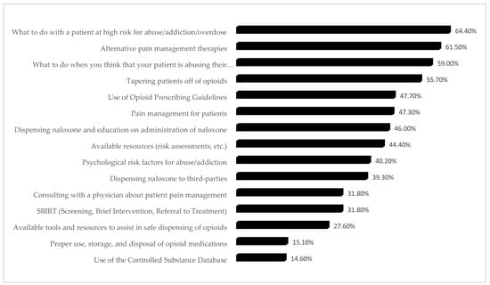 Only approximately 50% of respondents provided feedback regarding educational priorities. More than 50% of the respondents selected the following: (1) what to do when the patient may be abusing their medication, (2) alternative pain management, (3) how to manage patients at high risk for addiction, and (4) tapering patients off opioids as their education priority. With more than 80% of pharmacists using CSD, they did not believe they need further training on it as well as the use, storage, and disposal of opioids. While 44% wanted further education on risk assessment resources, 32% indicated the need for further education and training on the use of Screening, Brief Intervention, Referral to Treatment (SBIRT). The other educational priority was training on naloxone, both administration (44.4%) and dispensing (39.3%). Figure 4 describes in detail the educational priorities selected by the respondents.