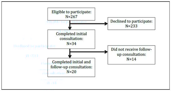 A total of 267 eligible patients met the inclusion criteria for this pilot study. Of these, 34 participated in the program, and 20 (59%) received both the initial and follow-up consultations (see Figure 1). Participants were typically female (60%), white (60%), non-Hispanic or Latino (60%), and younger (less than 40 years old, 60%), although all age groups were well represented in this study. Interestingly, 40% of participants were 31 to 40 years of age, while one fifth were less than 30 years of age. Additionally, seven participants did not report their race nor ethnicity. All participants had Medicaid as both their primary and secondary healthcare insurance. For further details, see Table 1.