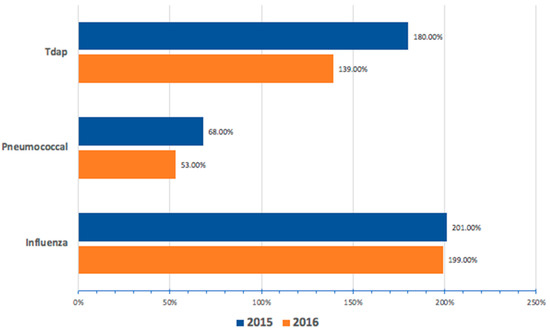 A total of 4083 beneficiaries were served at our Mobile Medicare Clinics from 2014–2016. Senior immunizations were a major part of the services provided. Overall, 1777 vaccines were administered during the study time period. Table 1 identifies the type and number of vaccines administered and billed at clinic sites from 2014–2016. As shown in Table 1, about two out of three of the vaccines provided during the study period were for influenza. Of the 1777 administered vaccines, 1345 (75.7%) were billed through TransactRx (Table 1); 832 (68.2%) influenza, 449 (99.6%) pneumococcal, and 64 (60.4%) Tdap. As shown in Table 1, 629 vaccines in 2014 were billed through an independent partnering pharmacy as a proof of concept. In 2015 and 2016, 411 and 305 vaccines, respectively, were billed directly using the TransactRx platform. A total of 432 vouchered vaccines were provided during the study period; 388 (89.8%) of which were for influenza. Figure 1 highlights the ROI for each provided vaccine in 2015 and 2016. The ROI was greatest for the influenza vaccine > Tdap > pneumococcal. The total net income was $11,905 and $8032 for 2015 and 2016, respectively (data not shown).