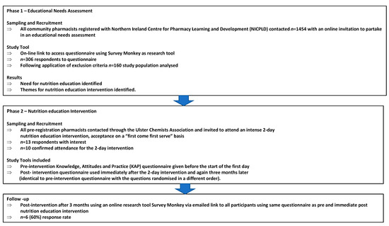 This study was sequentially designed using a mix of methods and was undertaken in 2 phases. (Figure 1). It was modelled, in part, on the Need for Nutrition Education/ Innovation Programme (NNEdPro) that continues to deliver nutrition training to medical students in the UK [19,20]. Four of the current researchers designed, delivered and evaluated the NNEdPro interventions. The educational work of NNEdPro continues to demonstrate the need for innovative ways to include nutrition in medical curricula to optimize patient outcomes. The questions now being asked are in relation to other healthcare workers who also have a role to play in health promotion and disease prevention.