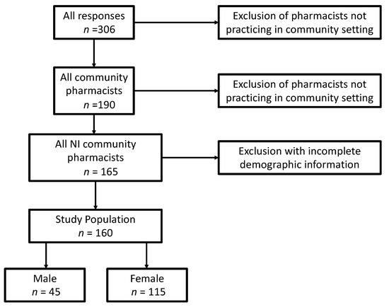 Three hundred and six questionnaires were completed and returned (a 15% response rate). After exclusion of those who did not meet the required inclusion criteria (Figure 2), 160 were eligible for analysis, providing a non-probability convenience sample size of 11% of registered community pharmacists in Northern Ireland.