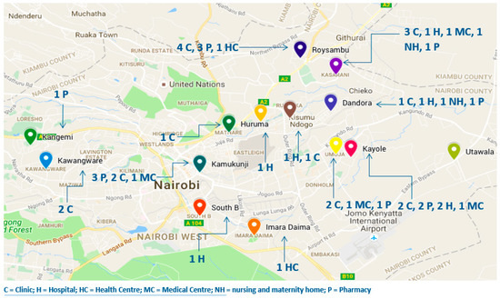 Nairobi County is divided into nine sub counties, of which five (Dagoretti, Starehe, Embakasi, Kamukunji, and Kasarani) were targeted for this study as these sub counties are home to some of the biggest slum dwellings in the country and inhabited by many people earning less than $1.25 per day [26]. The approximate geographical locations of the participating facilities are illustrated in Figure 1.
