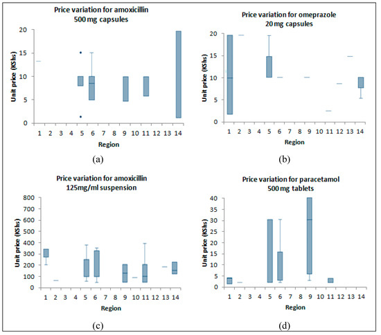 The prices of four of the most widely available products (amoxicillin 500 mg capsules, amoxicillin 125 mg/mL suspension, paracetamol tablets, and Omeprazole 20 mg capsules) were compared across the various regions included in the study. The data is graphically displayed in Figure 2. Inter-regional variations in median prices were observed for all products.