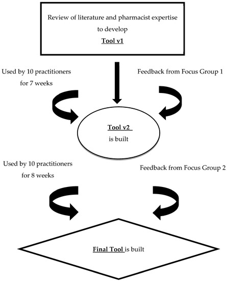 The tool was iteratively developed and refined based on two rounds of testing in practice and focus groups with CMM pharmacists. The methods are described by tool development, testing, and focus groups, as seen in Figure 1.