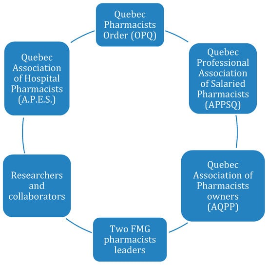 A committee of partners including the key organizations interested in the practice of pharmacists in FMG was established. The partners composing the advisory committee are detailed in Figure 1. The group was established to provide strategic direction and ensure alignment with activities for FMG pharmacists within their respective organization. They were consulted early on to provide guidance on needs assessment questionnaires and to discuss identification and recruitment of FMG pharmacists. Once the needs assessment was completed, the committee commented and challenged the content and prioritization of the action plan developed by the working group and made recommendations for the working group to consider. Between January 2018 and May 2019, two meetings took place with the advisory committee and frequent email communications provided ongoing updates to the advisory committee members.