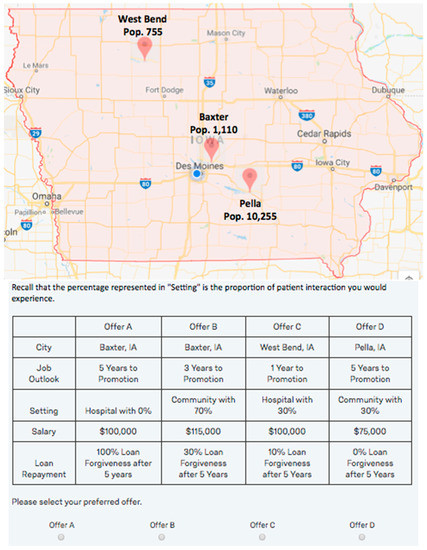 By understanding what financial incentives are necessary for students to work in a variety of settings, employers would also know how much additional salary would be necessary to attract students to fill their open, less desirable positions. The objective of this study was to determine required financial incentive to encourage pharmacy students to work post-graduation in different practice and geographic settings in NABP/AACP District 5 (Iowa, North Dakota, South Dakota, Nebraska, Minnesota, Saskatchewan, and Manitoba).